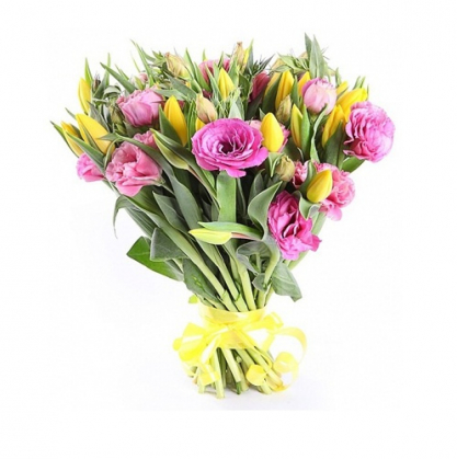 Букет из желтых тюльпанов розовой эустомы